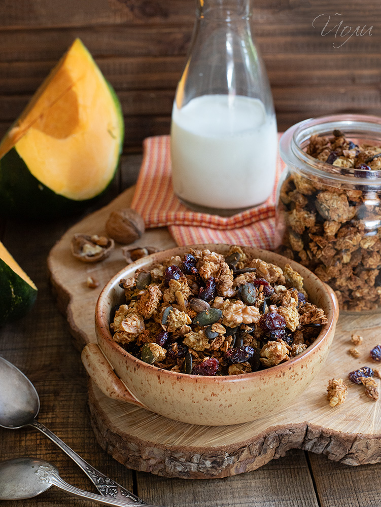 Гранолата е овкусена с подправки за тиква и е обогатена с орехи, тиквени семки, кокос и сушени червени боровинки. Всъщност задължителни добавки няма. Всеки може да сложи това, което обича. Мазнината е важен компонент и не трябва да се пропуска. Добре е да е кокосово масло или друго растително с по-неутрален вкус като олио от рапица или гроздови семки. За мен кокосовото масло е оптимален вариант.
